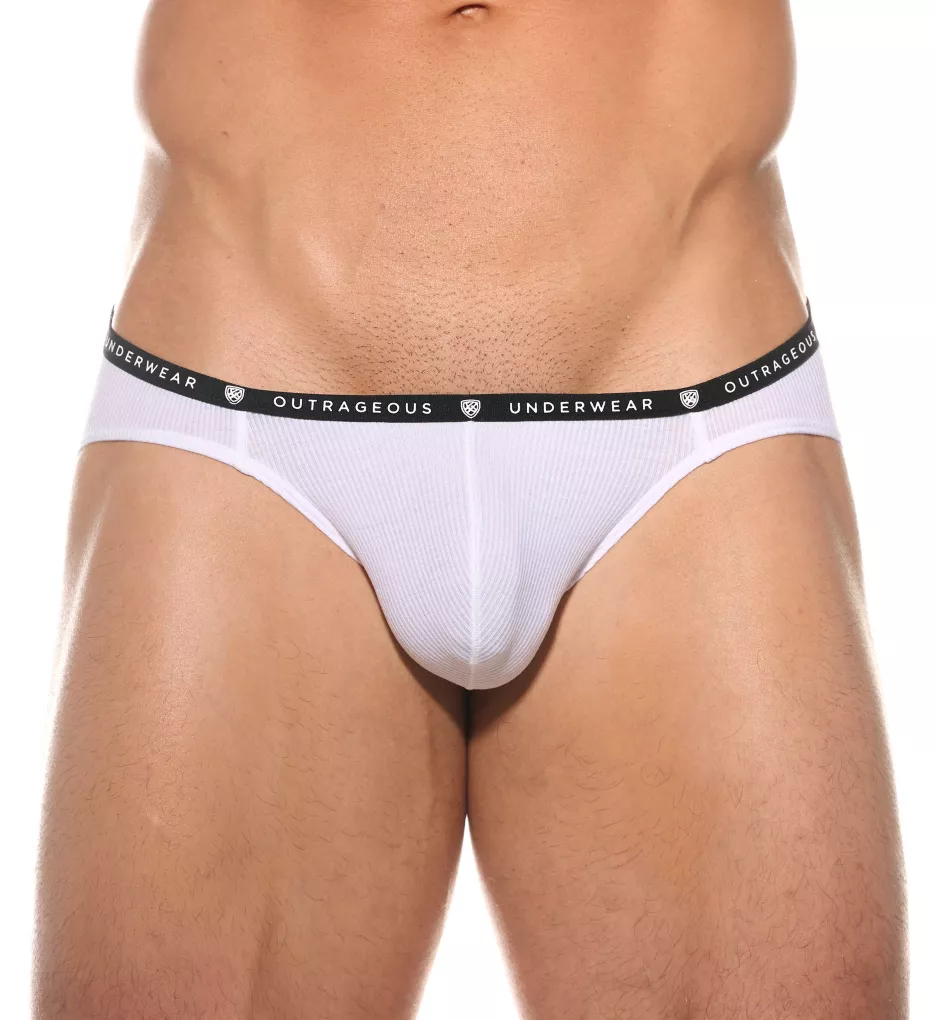- Contrast waistband has repeating “Outrageous Underwear” and logo .