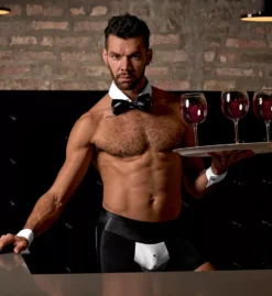Be ready to serve in this sexy Butt-ler costume, designed with a tuxedo look and matching accessories. Made from polyester and spandex.