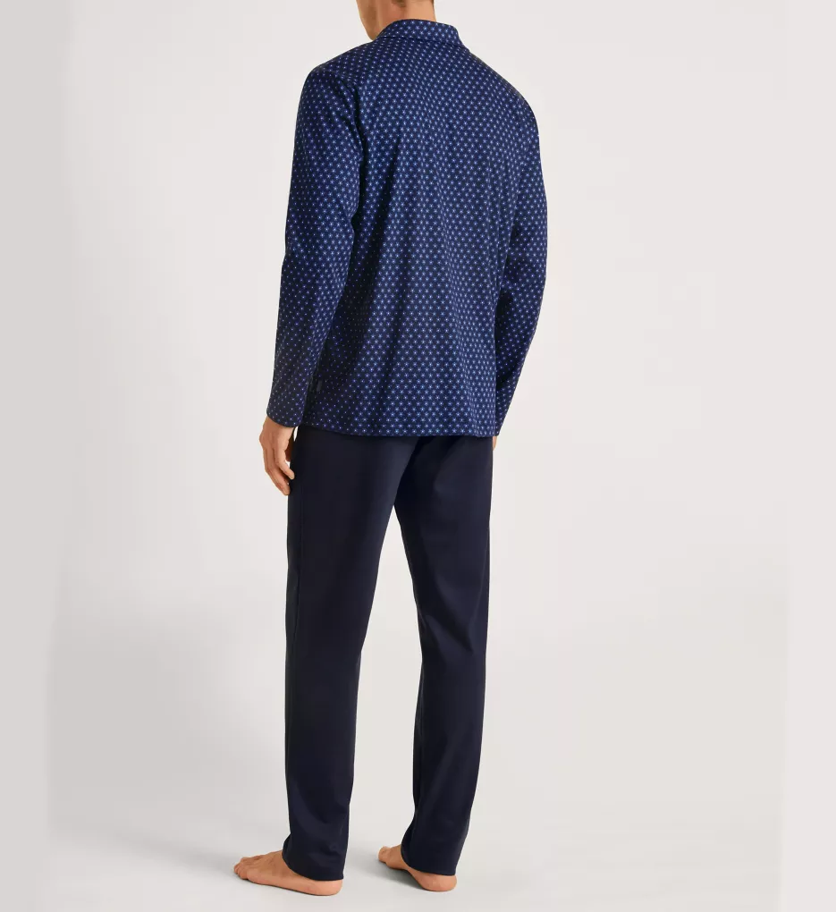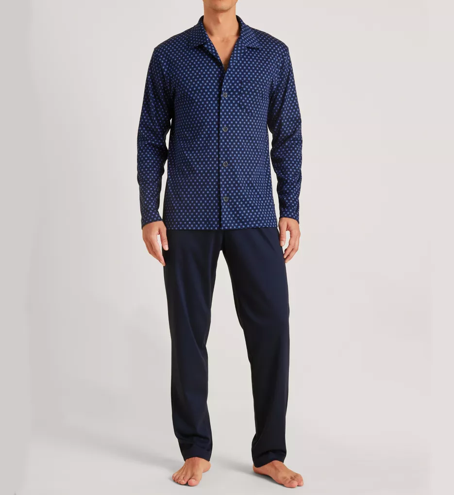 Designed for the modern man, this pajama set features a bold geometric pattern on value down top and solid colored pants. Made of Supima swiss+cottonknit cotton for softness.