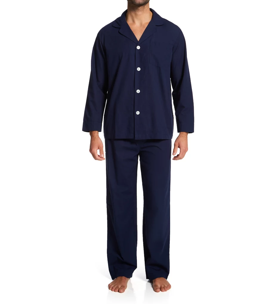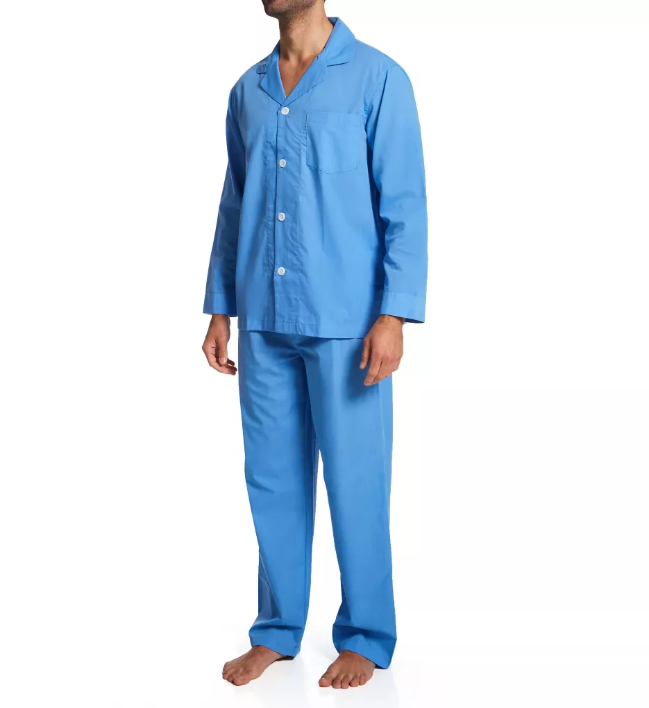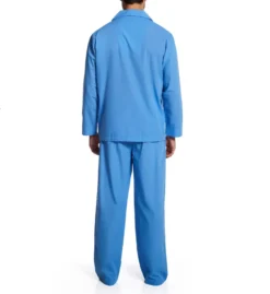 Solid colored pajama set gives you notch collar top with long sleeves, front value closure, and value fly pants. Made of woven polyester and cotton.