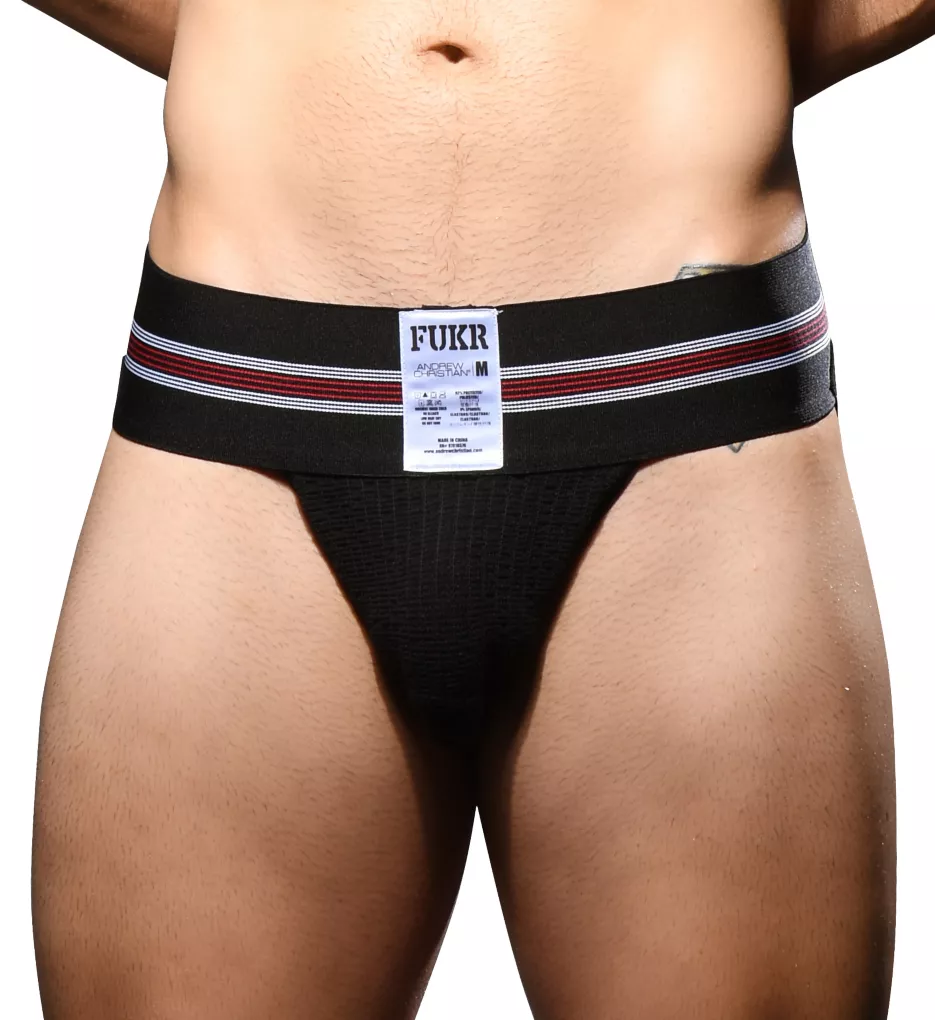 Flyless jockstrap delivers retro style with its extra wide waistband and stripe detail. Signature “Hang-free Pouch” has textured stretch knit to keep your “package” snug and in place. Made of polyester and spandex.
