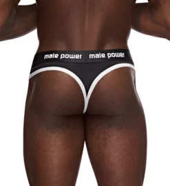 Steamy thong enhances your profile with its removable padded pouch. Solid colored knit is incredibly soft and has contrasting details at leg openings and center cut-out. Made of rayon and spandex.