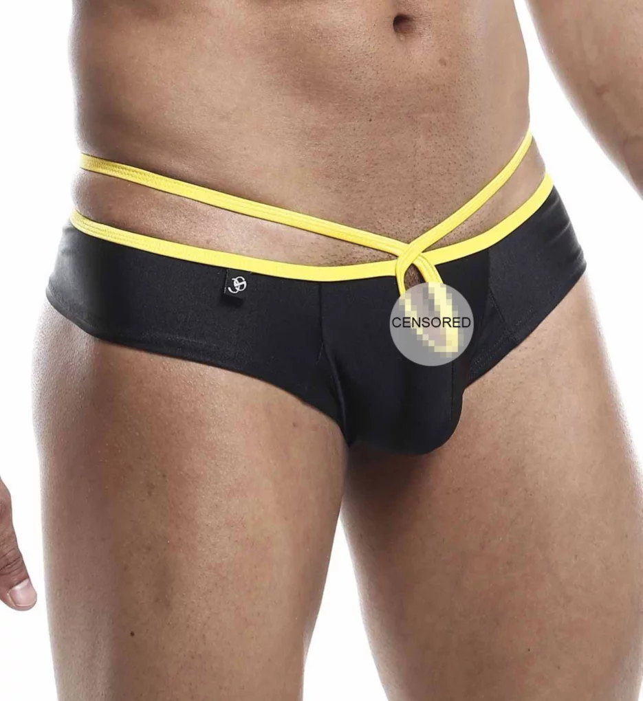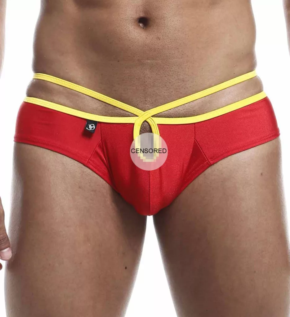 - Bulge-baring contour pouch with peek-a-boo keyhole at top.