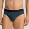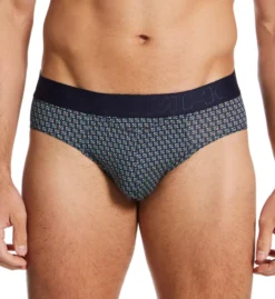 Low slung brief has an extra soft blend of fabrics, a fly opening across top of pouch, and a geometric pattern. Made of modal, cotton, and elastane.