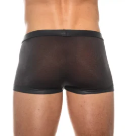 - Boxer brief features faux leather details at waist, leg openings, and crossover bands.