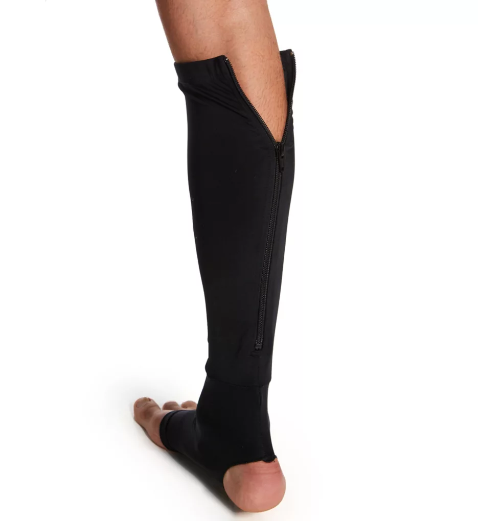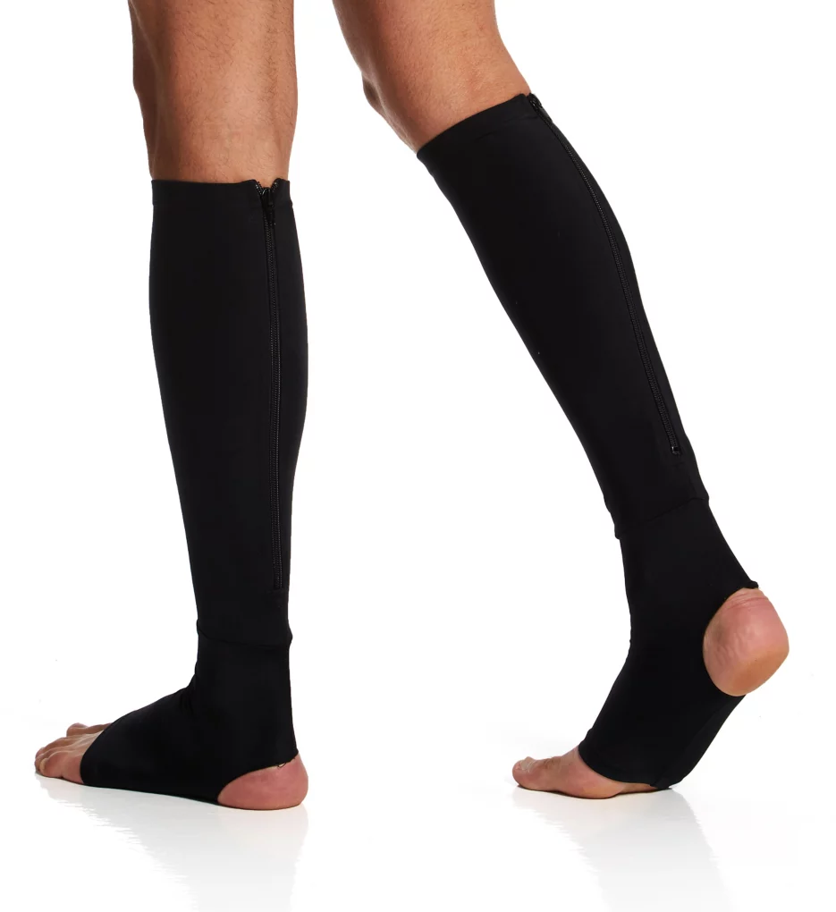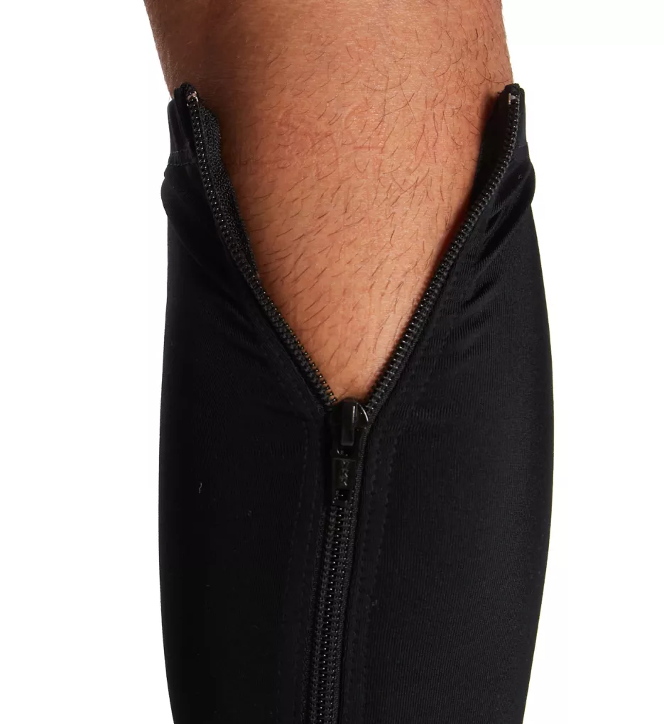 This pair of open toe knee socks has metal zipper at back, so you can take this style on and off with ease. Microfiber knit has firm compression for support, moisture control for dryness, and even SPF 50 for more protection from the sun. Made of nylon and spandex.