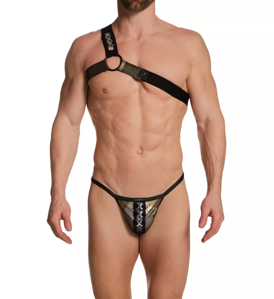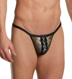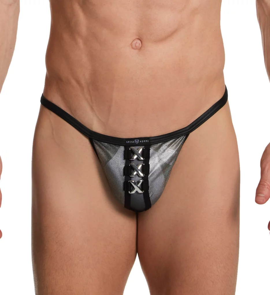 Sheer G-string has shimmery mesh pouch with metal X’s at center top for a touch of bling. Made of nylon and spandex.