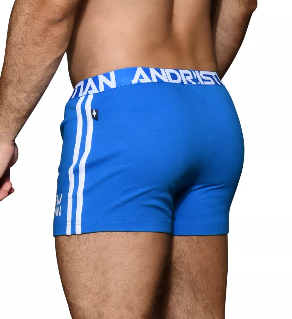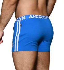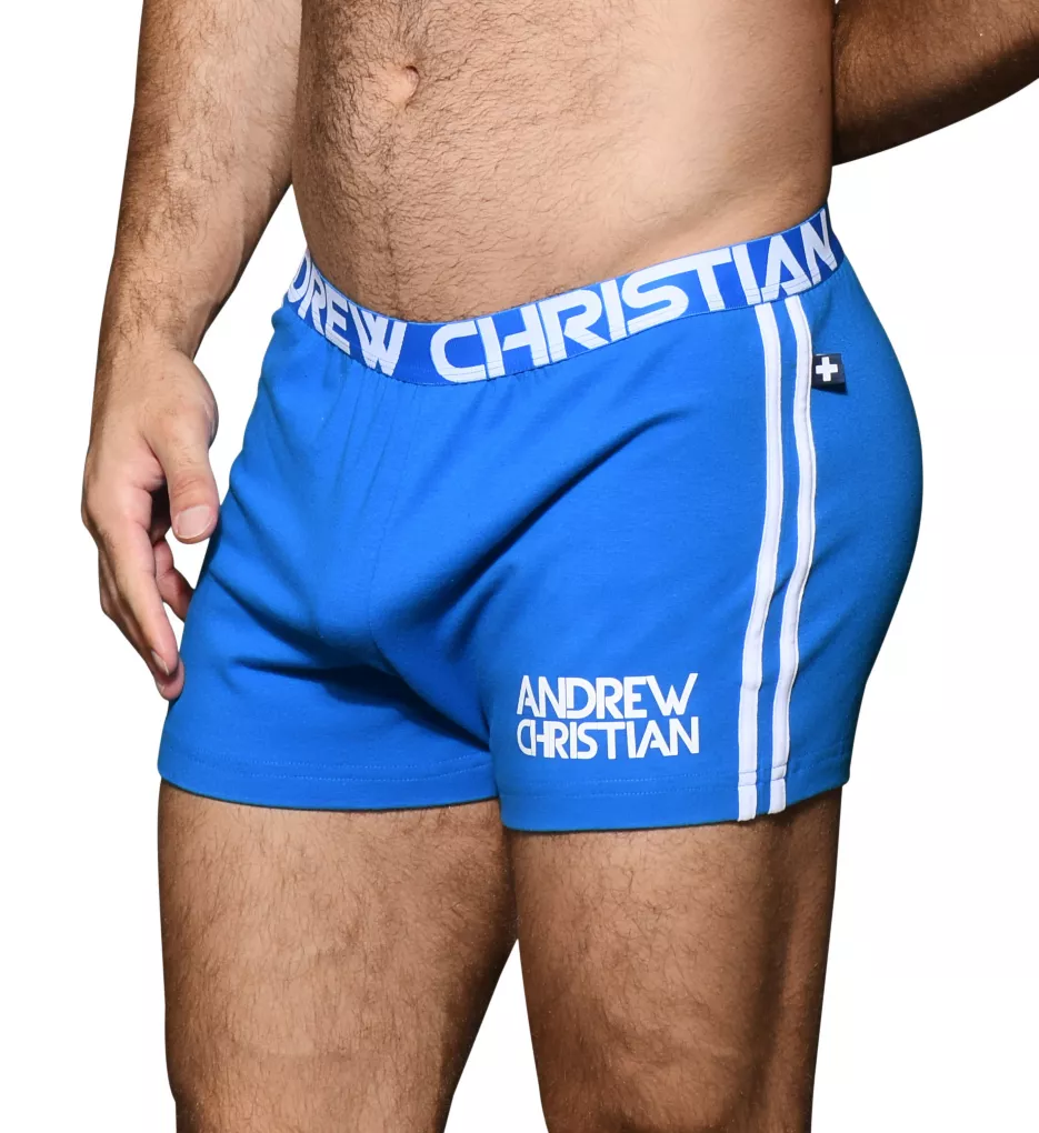 Form-fitting shorts have contrast side stripes and heat transferred logo at bottom of left leg for a sporty style. Made of cotton and spandex.