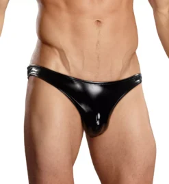 You’ll be left breathless by this bikini with its jock brief styling and its glossy, faux leather surface. Made from nylon and spandex.