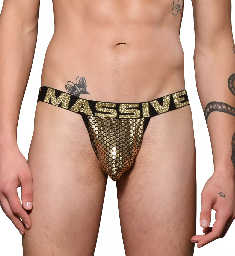 Bling it on! This sparkly metallic-look sequined jock celebrates your masculinity unmistakably. Say goodbye to sticking, squashing, chafing, sweating, and having to readjust. Made of polyester, cotton, and spandex.