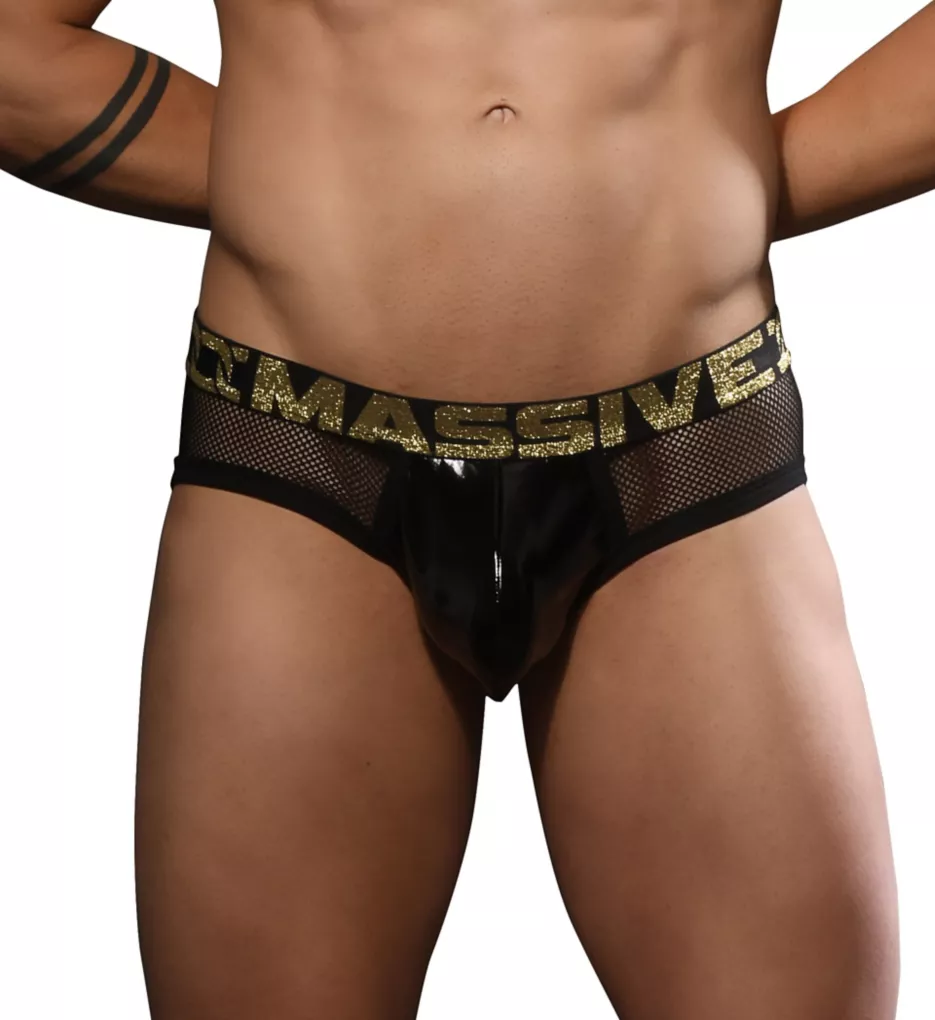 - Waistband has glittering gold “Massive” at center front and chain graphic circling to back.