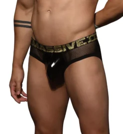 See-through brief has fishnet design with faux leather contour pouch for a seductive style that barely leaves anything to the imagination. Made of polyester, polyurethane, and spandex.