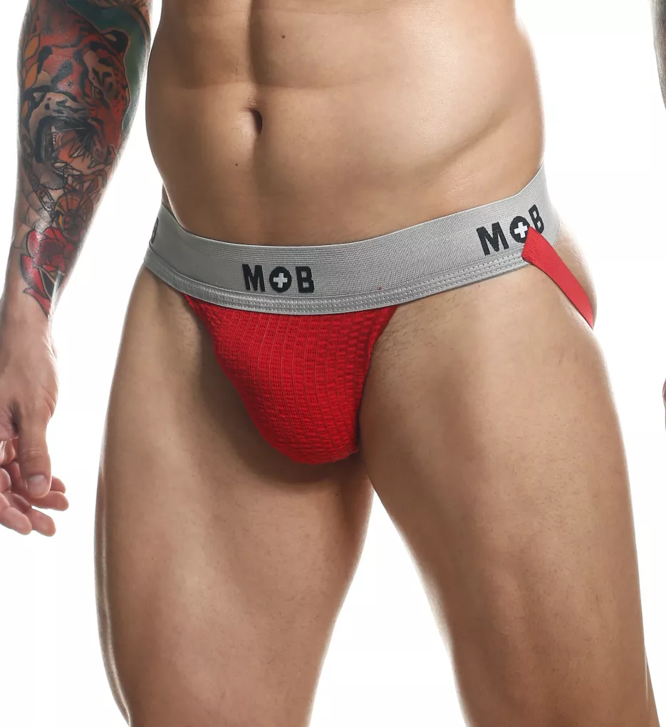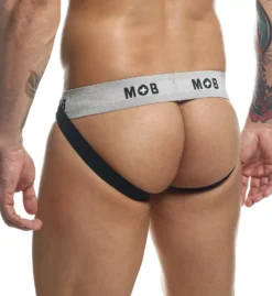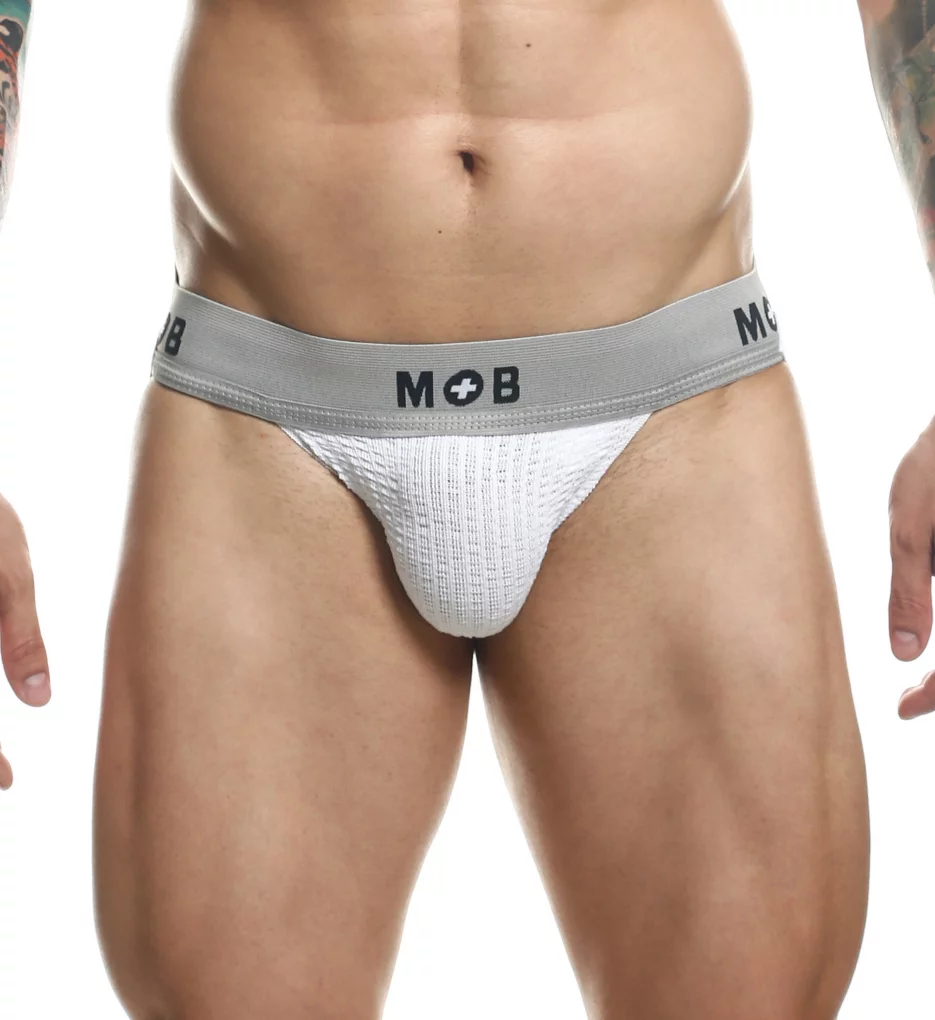 - Wide jockstraps have ribbed elastic to keep fit in place.