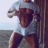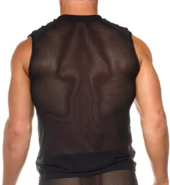 V-neck muscle shirt has see-through mesh body with crossband detail at shoulders. Made of polyamide and elastane.