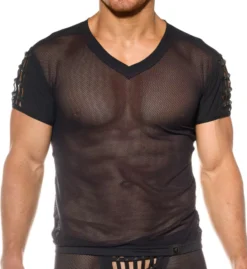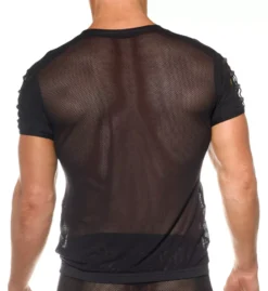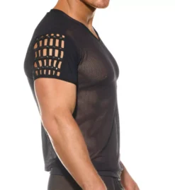 Sheer mesh t-shirt has short, microfiber sleeves with crossband detail at top. Made of polyamide and elastane.