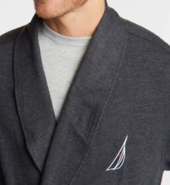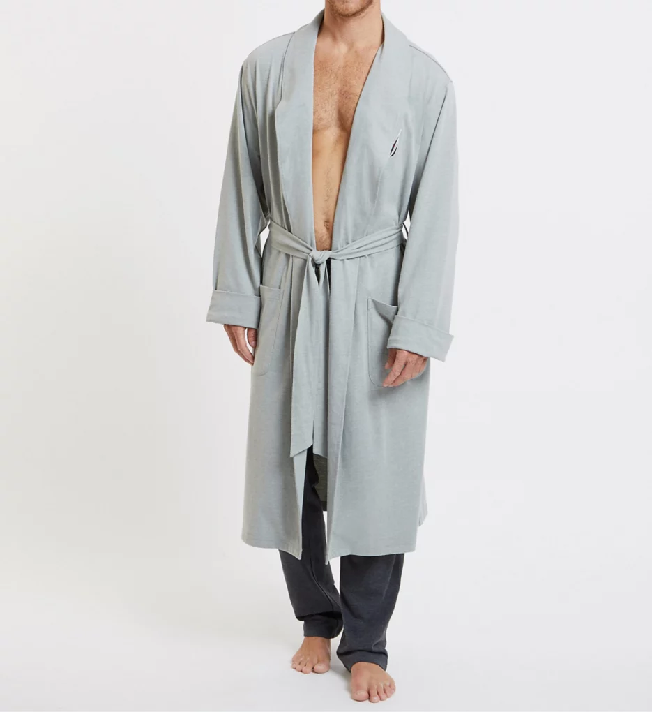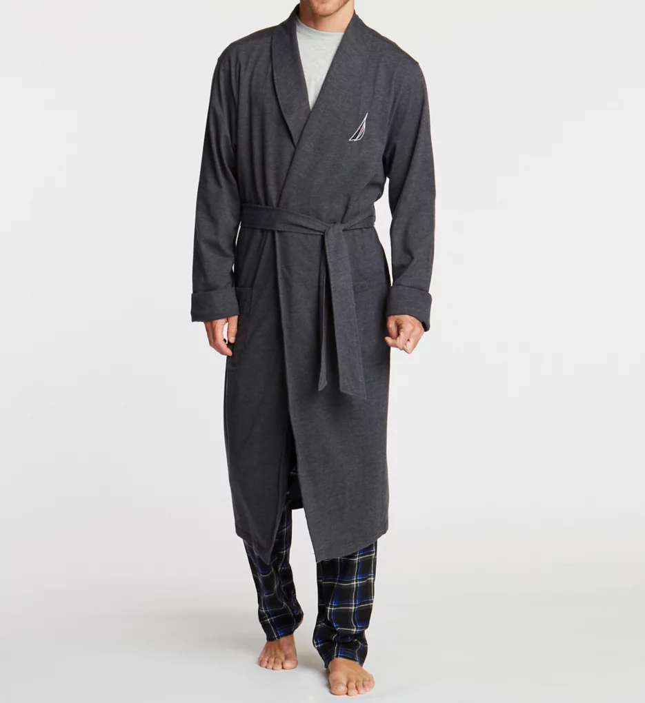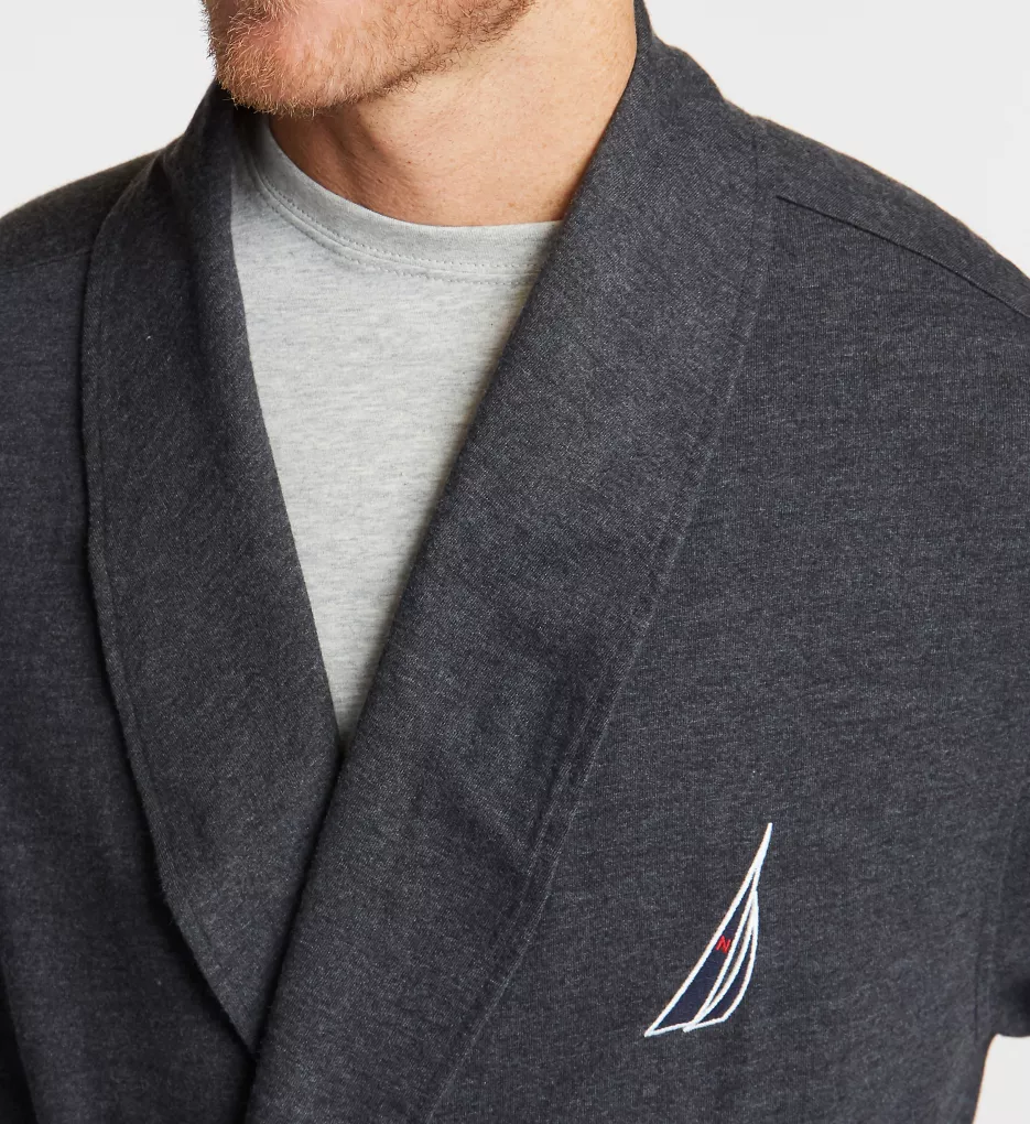 Classic knit robe with a sueded texture for a softer, richer feel. Made of a jersey-knit blend of cotton and polyester.