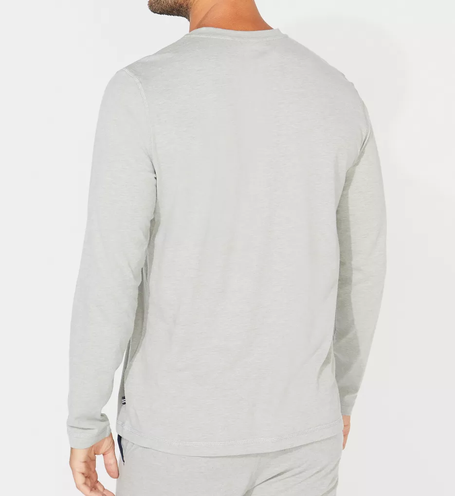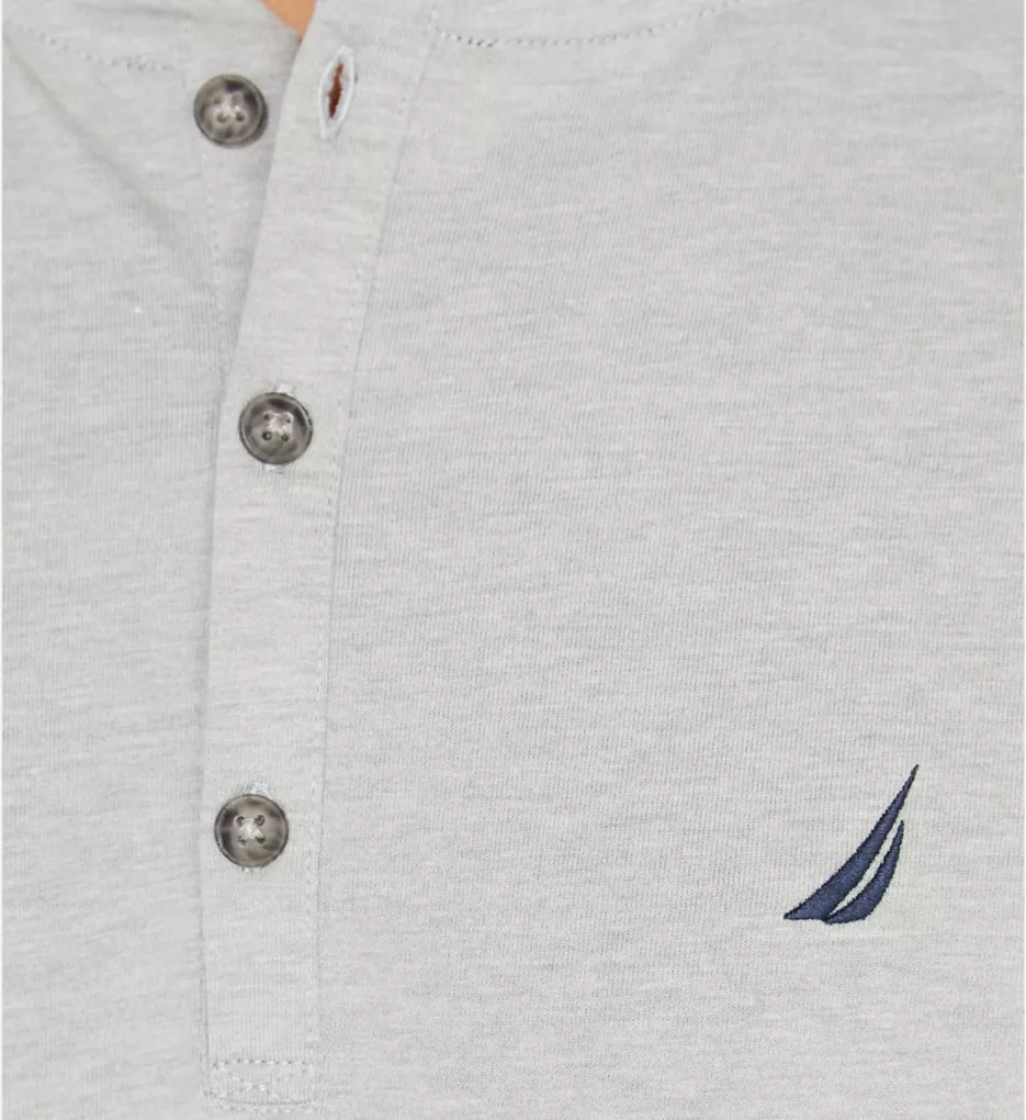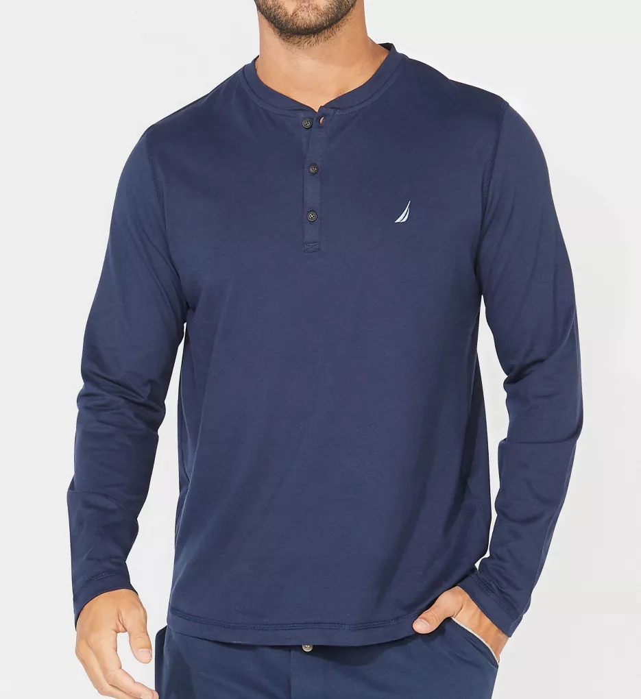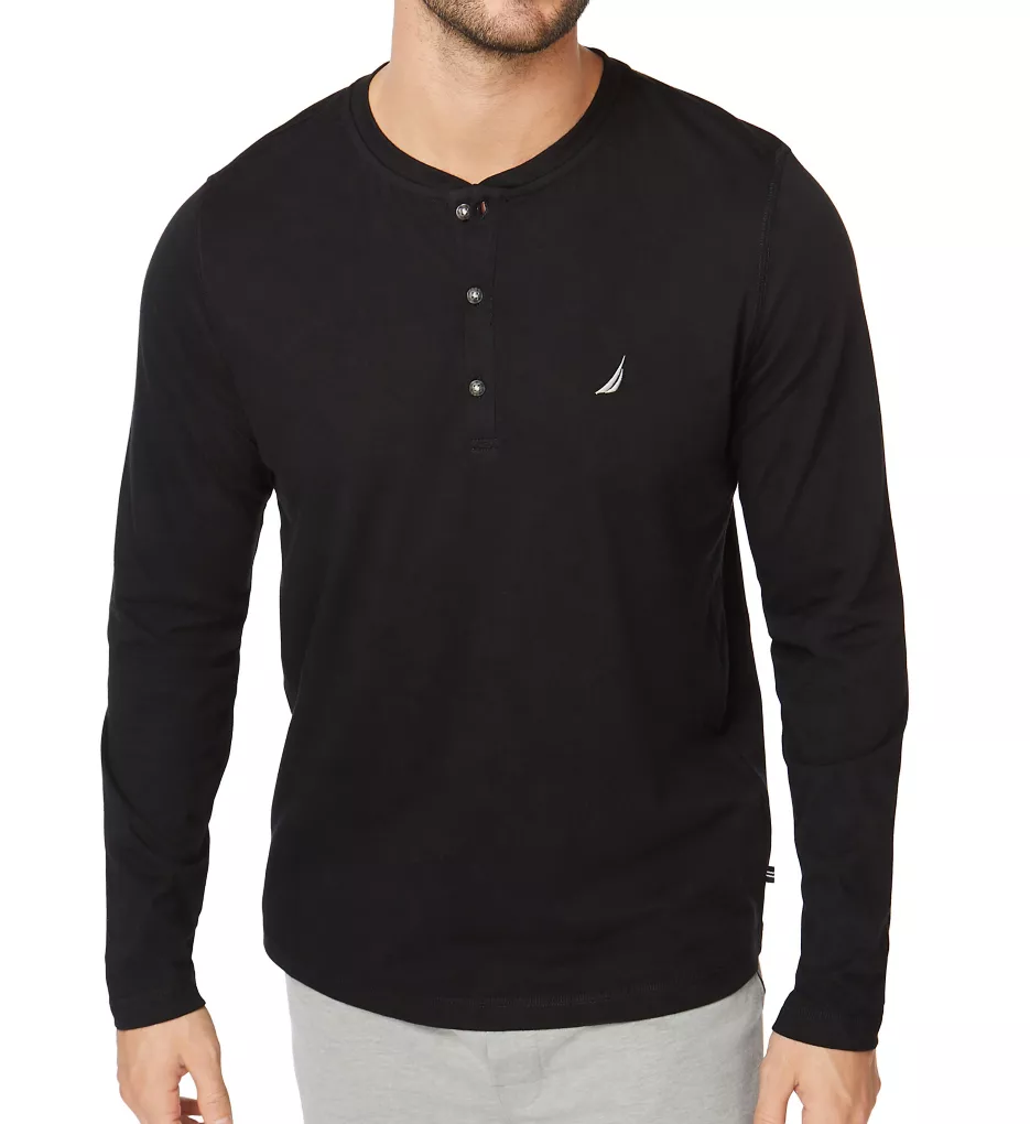 Jersey-knit henley allows you to open up neckline and has a sueded feel for a richer texture. Made of cotton and polyester.