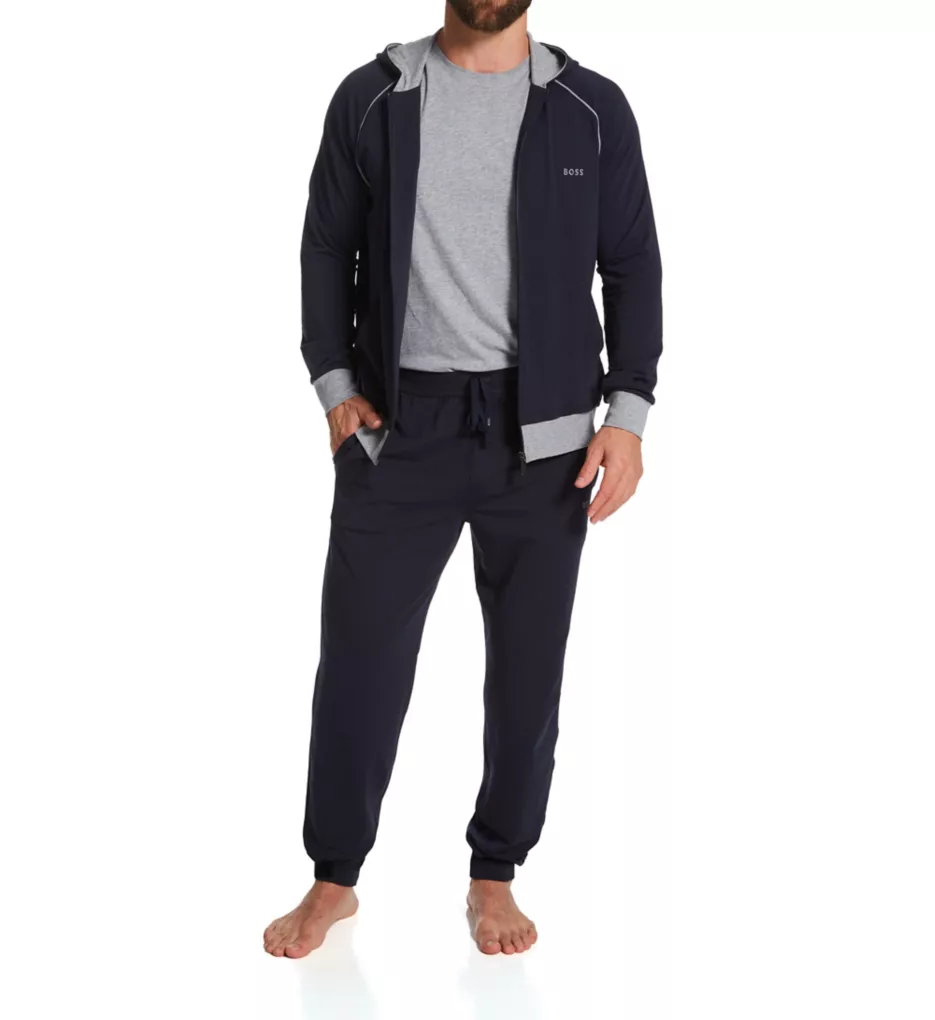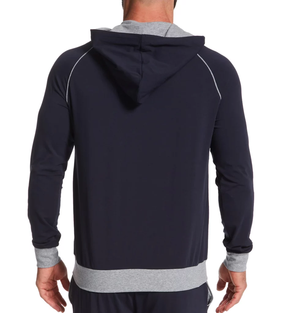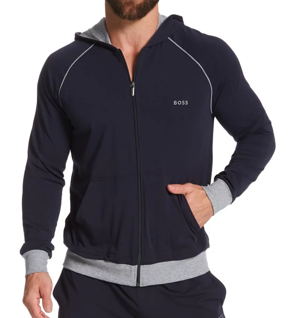 Soft zip front lounge hoodie with sophisticated styling. Made of knit cotton with elastane.