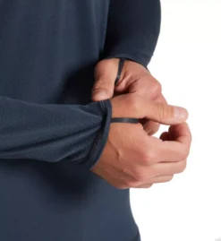 - Long, raglan sleeves have elastic thumb loops sewn into cuffs to keep sleeves in place.