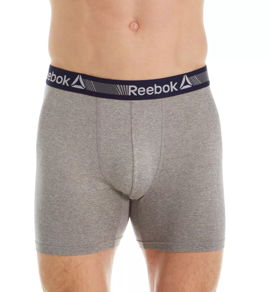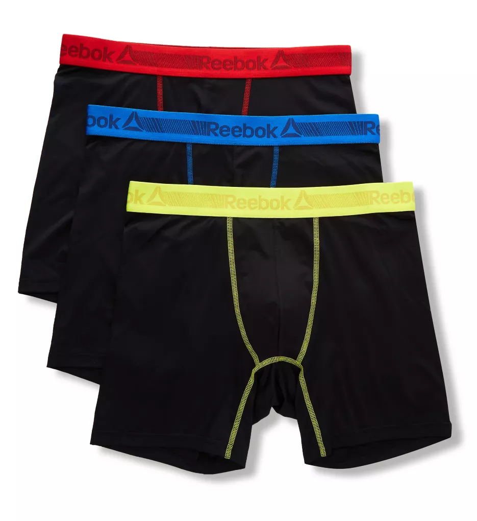 - Soft-backed exposed elastic waistband with repeated Reebok logos.