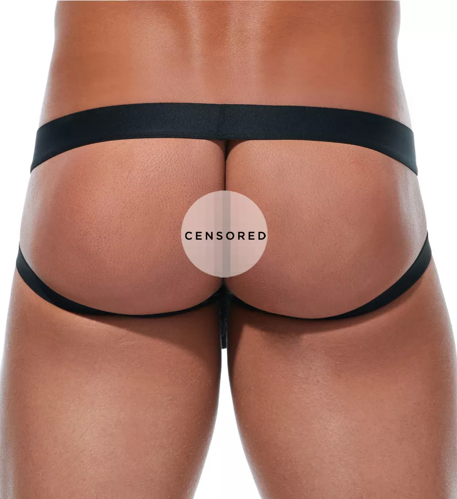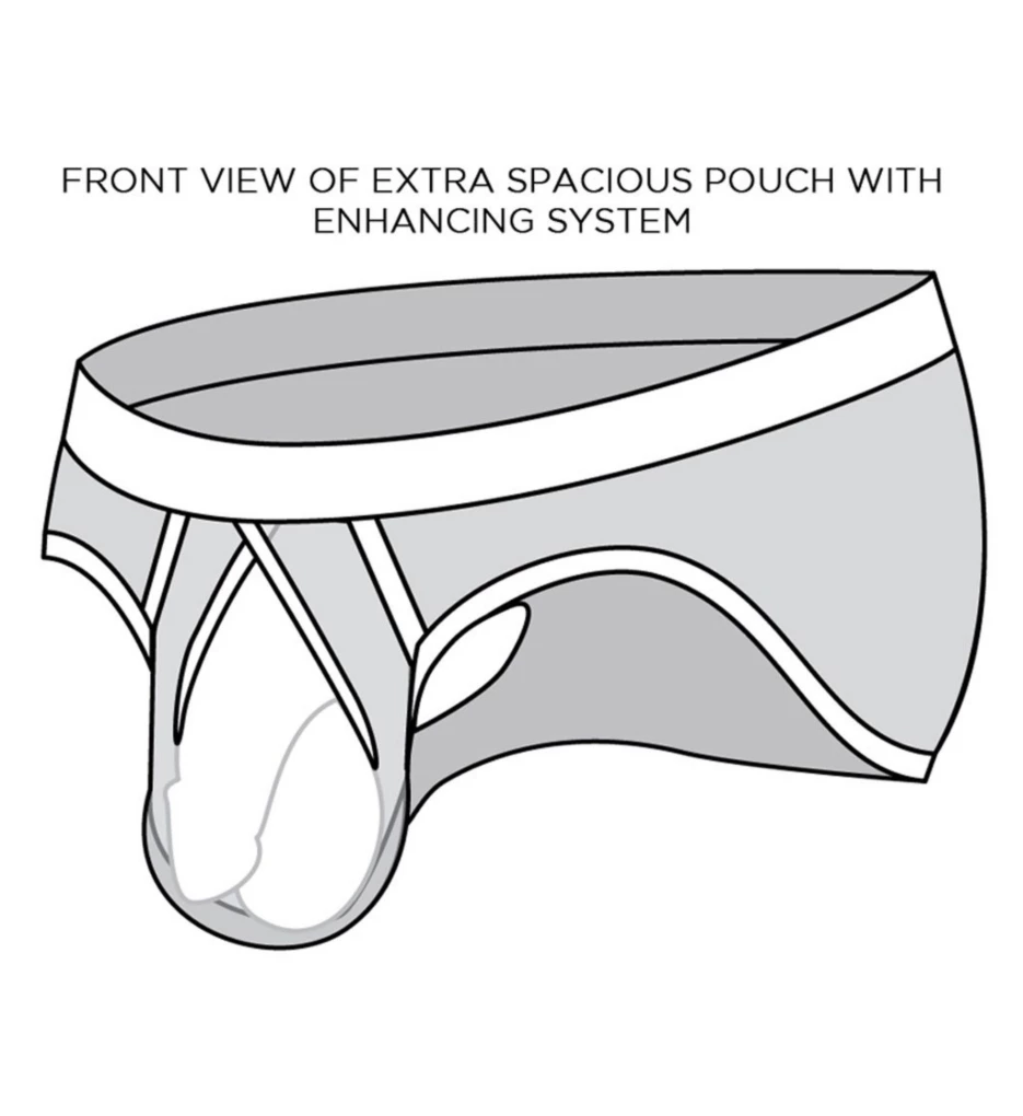 - Soft elastic jock bands connect to top and base of pouch instead of waistband.