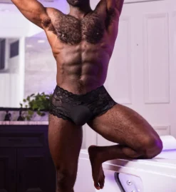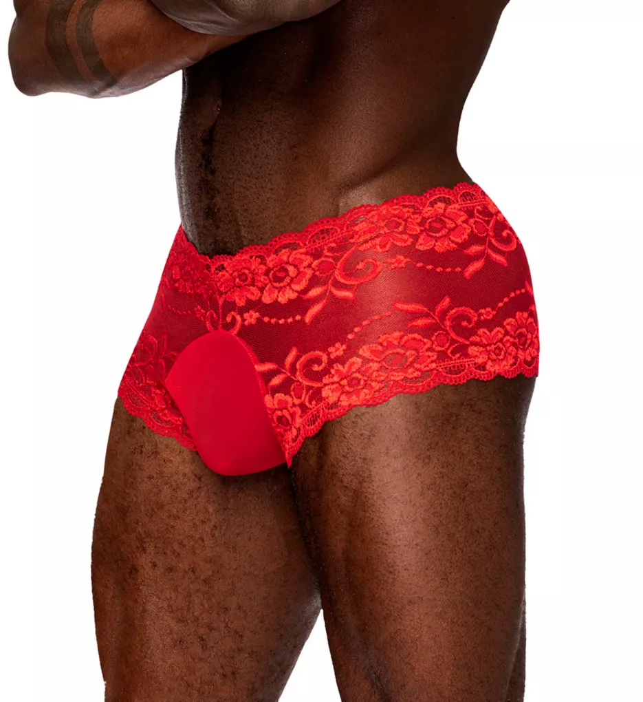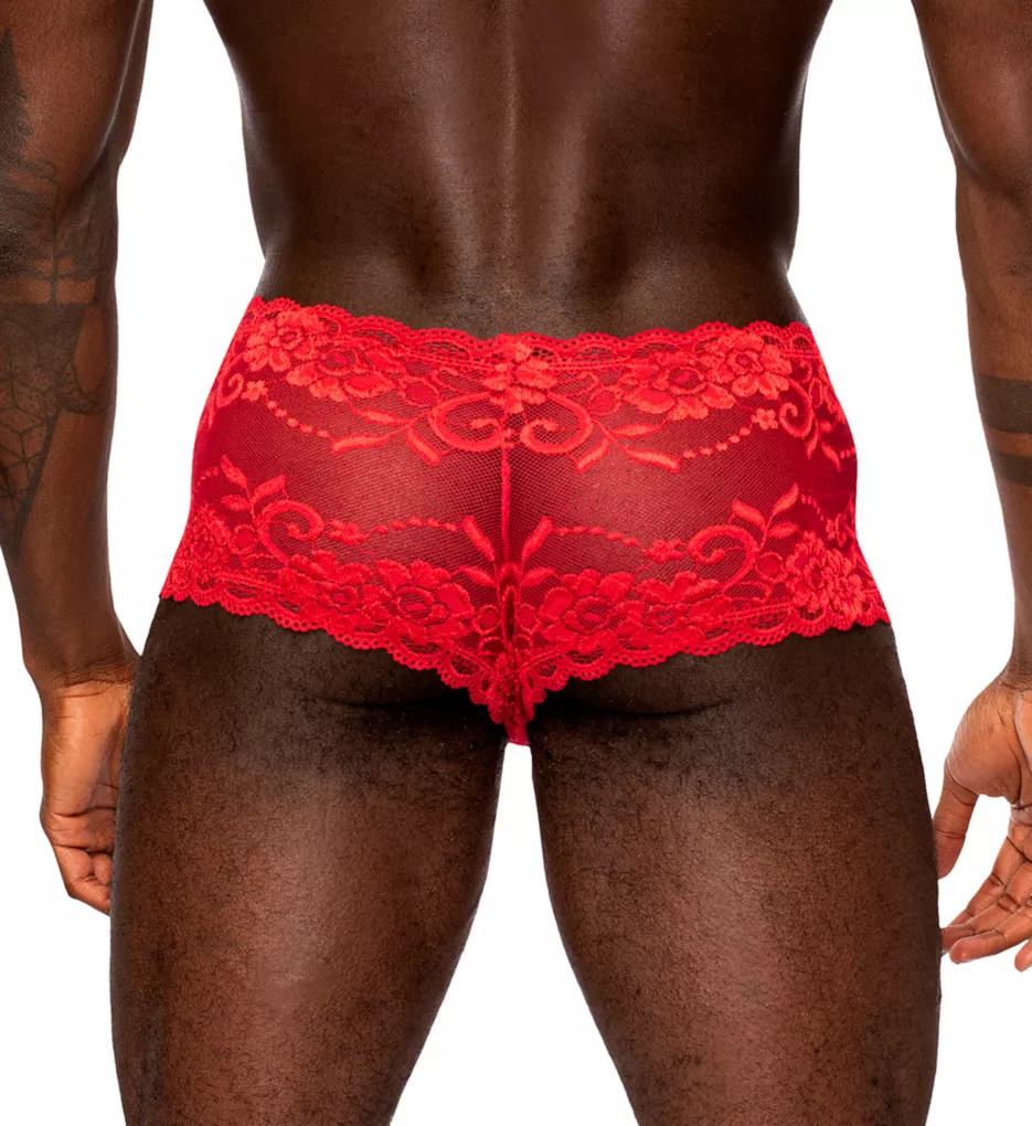 Playful mini short is sheer stretch lace and has flyless mesh pouch for shape. Made of nylon and spandex.