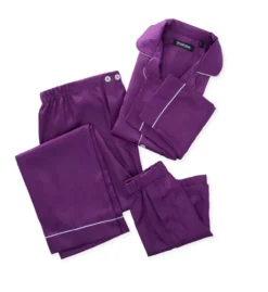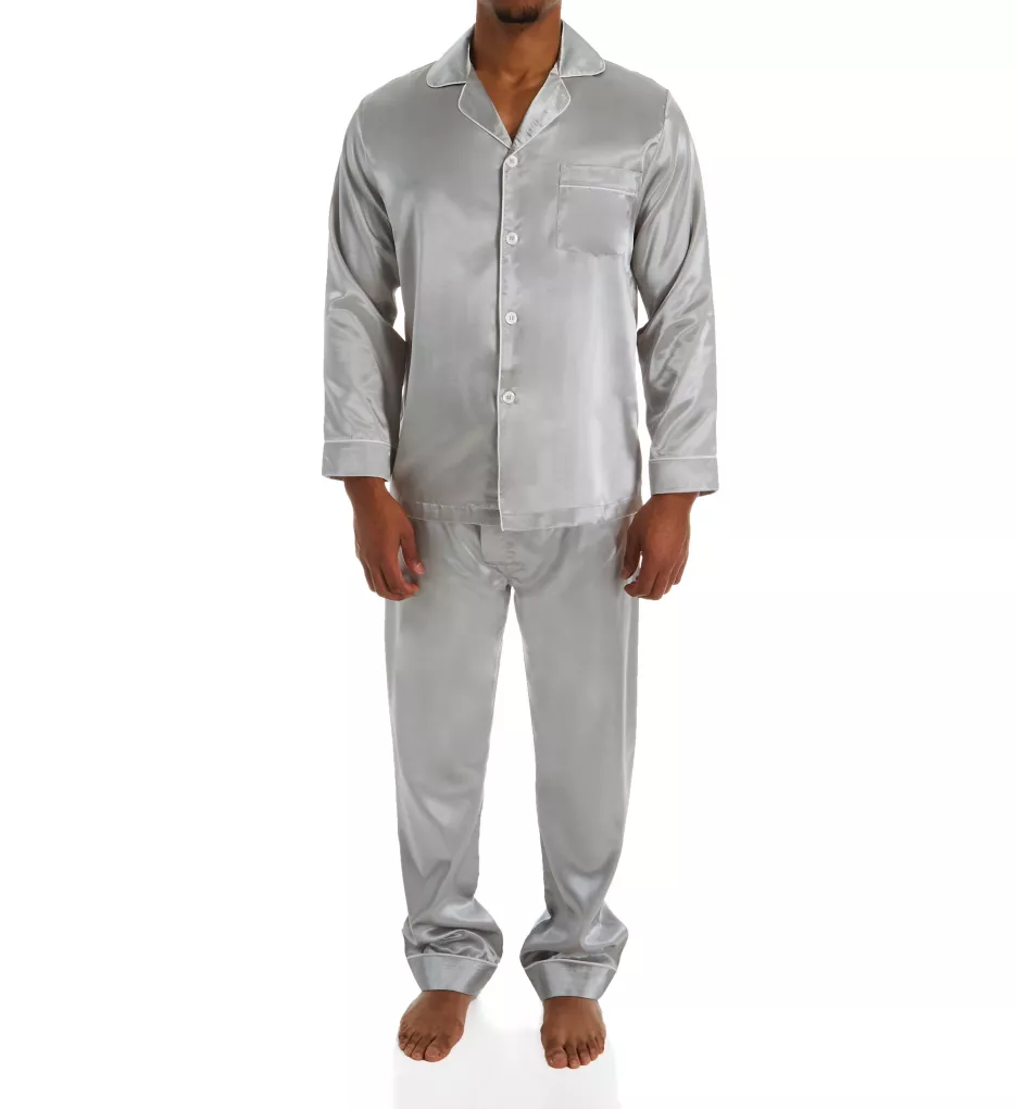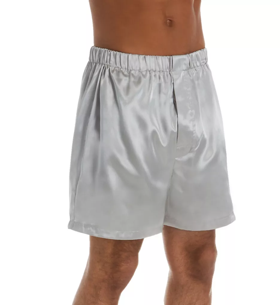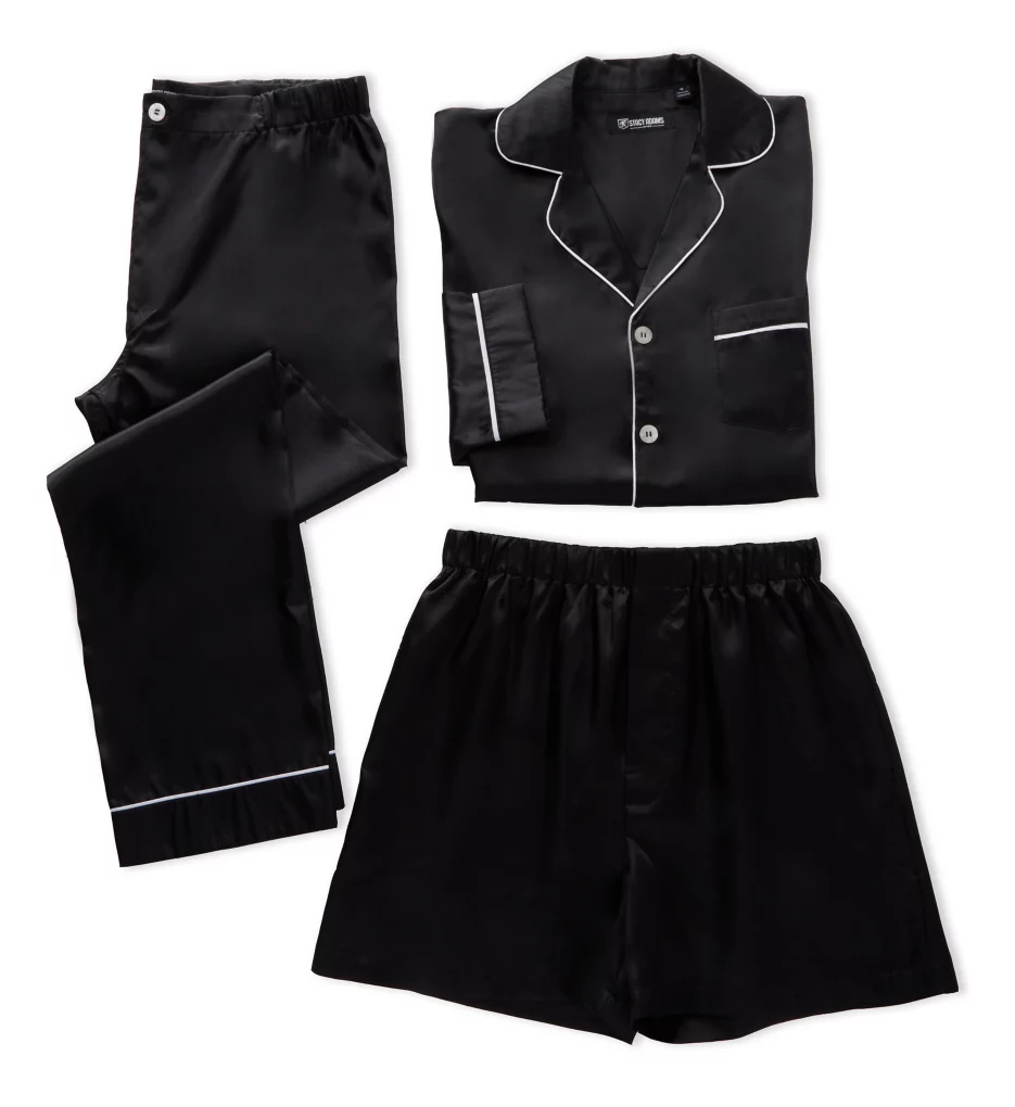 - Set includes a pajama top, pajama pants, and satin boxer shorts.