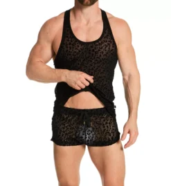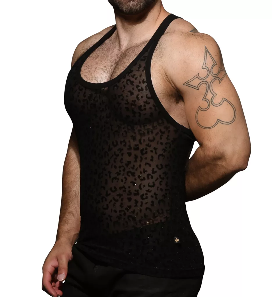 Fierce, sexy tank features a see-through look so the leopard pattern shows on your skin and sparkles with golden glitter. Made of polyester and spandex.