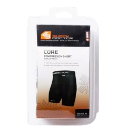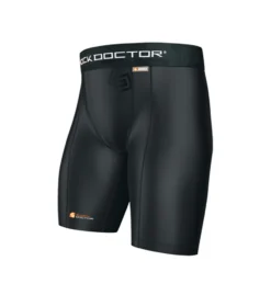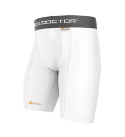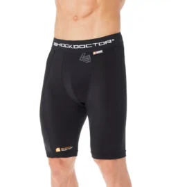 - Wide, soft exposed elastic Shock Doctor waistband with fabric tag at center back.