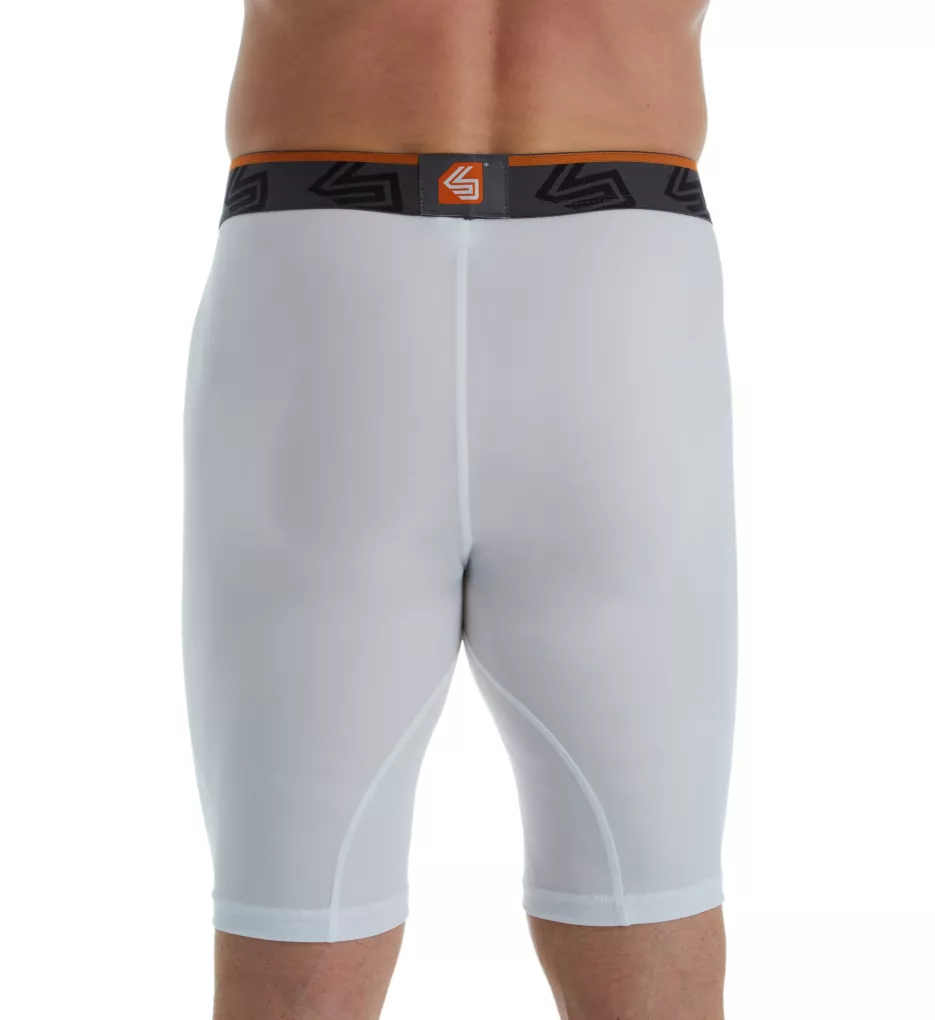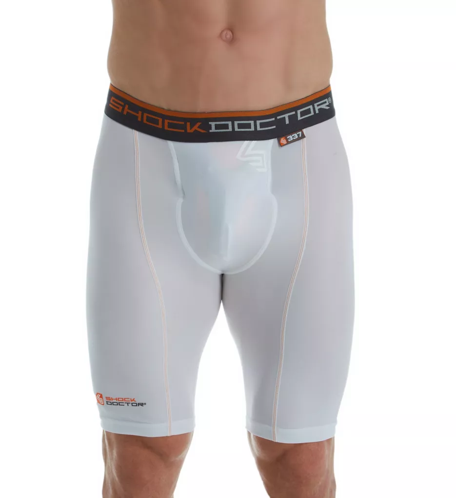 - Shock Doctor logo patch sewn onto back waist has the 337 style number tag attached to front left.