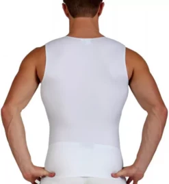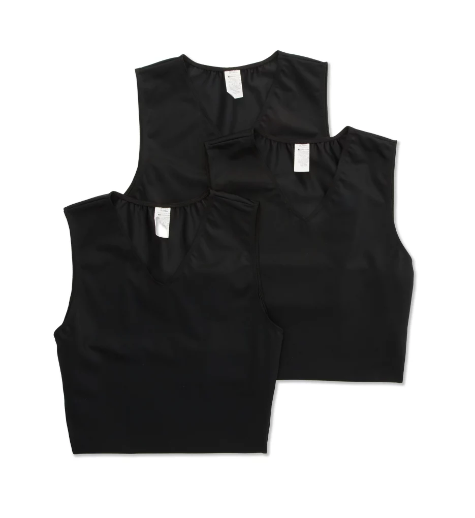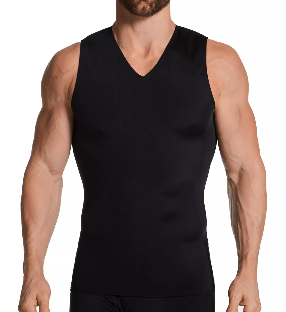 V-neck tank top helps you achieve a slimmer look in a matter of seconds with its compression microfiber knit. Comes in a three pack. Made of nylon and spandex.