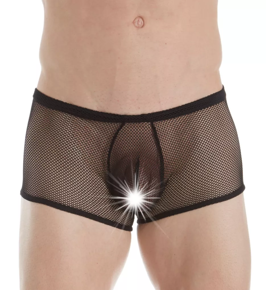 See-through fishnet trunks with opening at rear. Made of nylon and spandex.