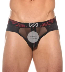High rise brief features shiny rose print waistband, sheer mesh zip-up pouch, and polka dot pattern on microfiber body. Made of polyester and spandex.