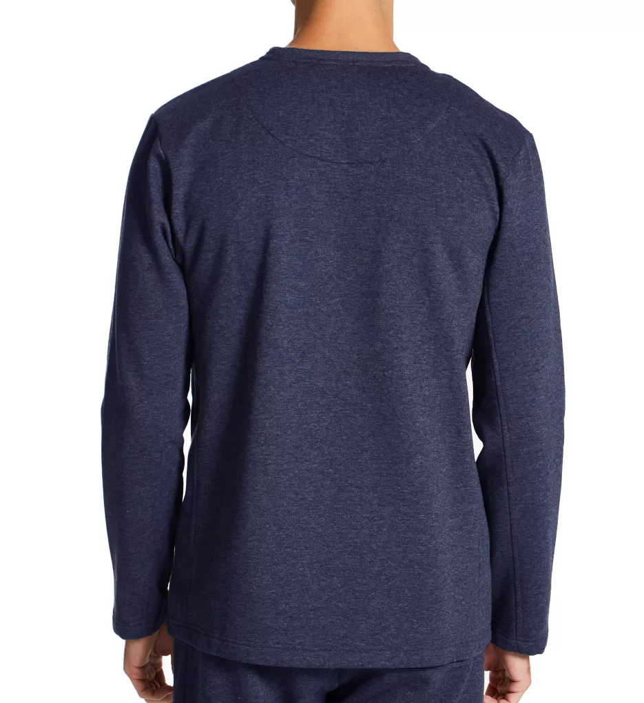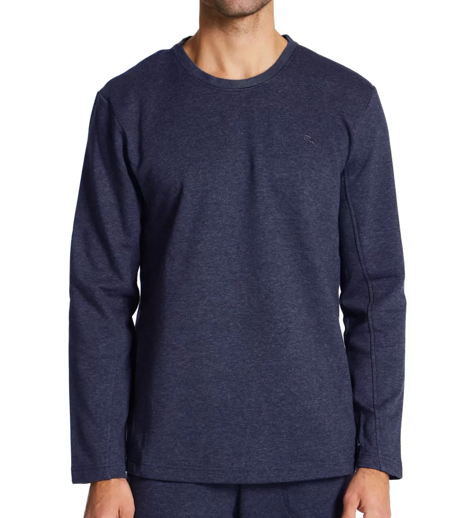 - Wide crewneck has a contrast band with a brushed texture.