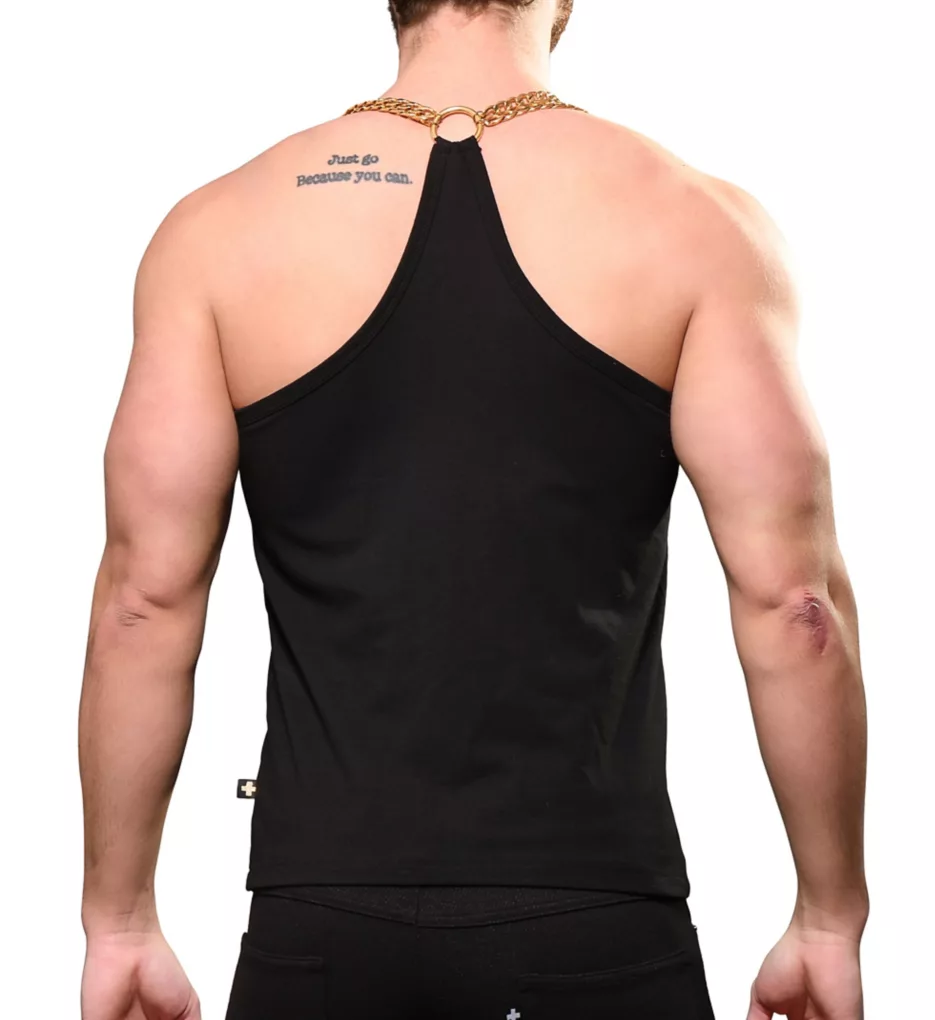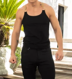 Form-fitting tank has double chain accents at shoulders that create a racerback style. Made of cotton and spandex. Chains are made of zinc alloy.