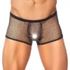 Zip it! Zip it good! This hot trunk really shines with the silvery metal zipper that is sewn into the pouch. Made of polyester with spandex for stretch.